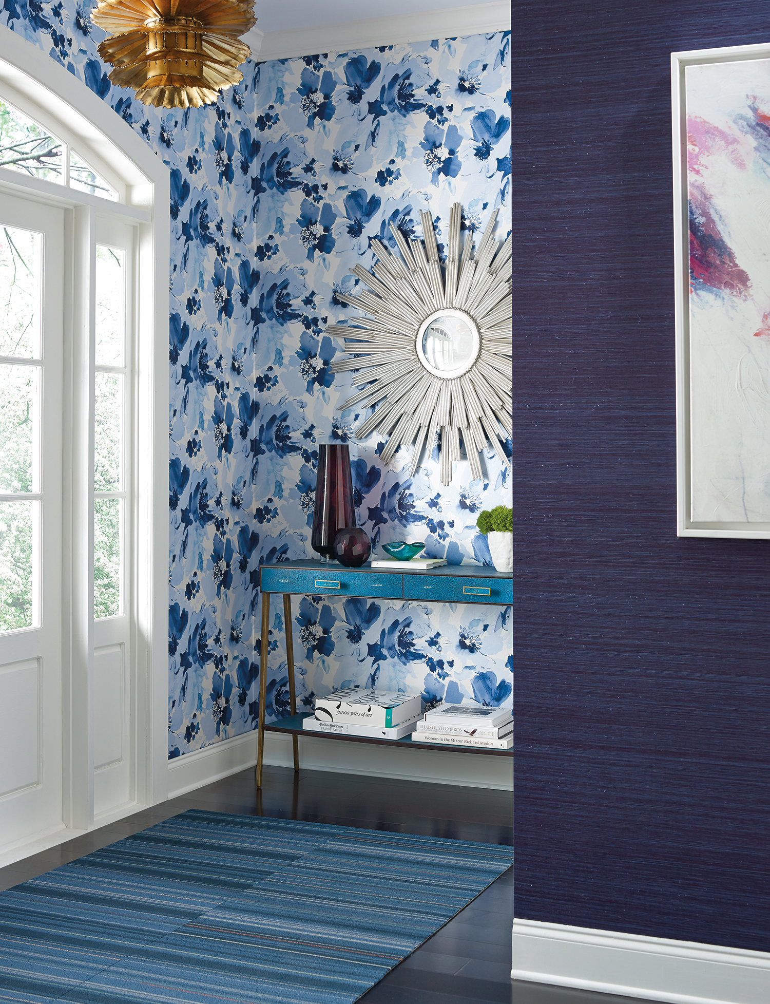 This bold blue teams well with white for a refreshing Mediterranean inspired vibe, while also appearing rich and sophisticated when paired with black and grey. Check out our Aquarella pattern below.