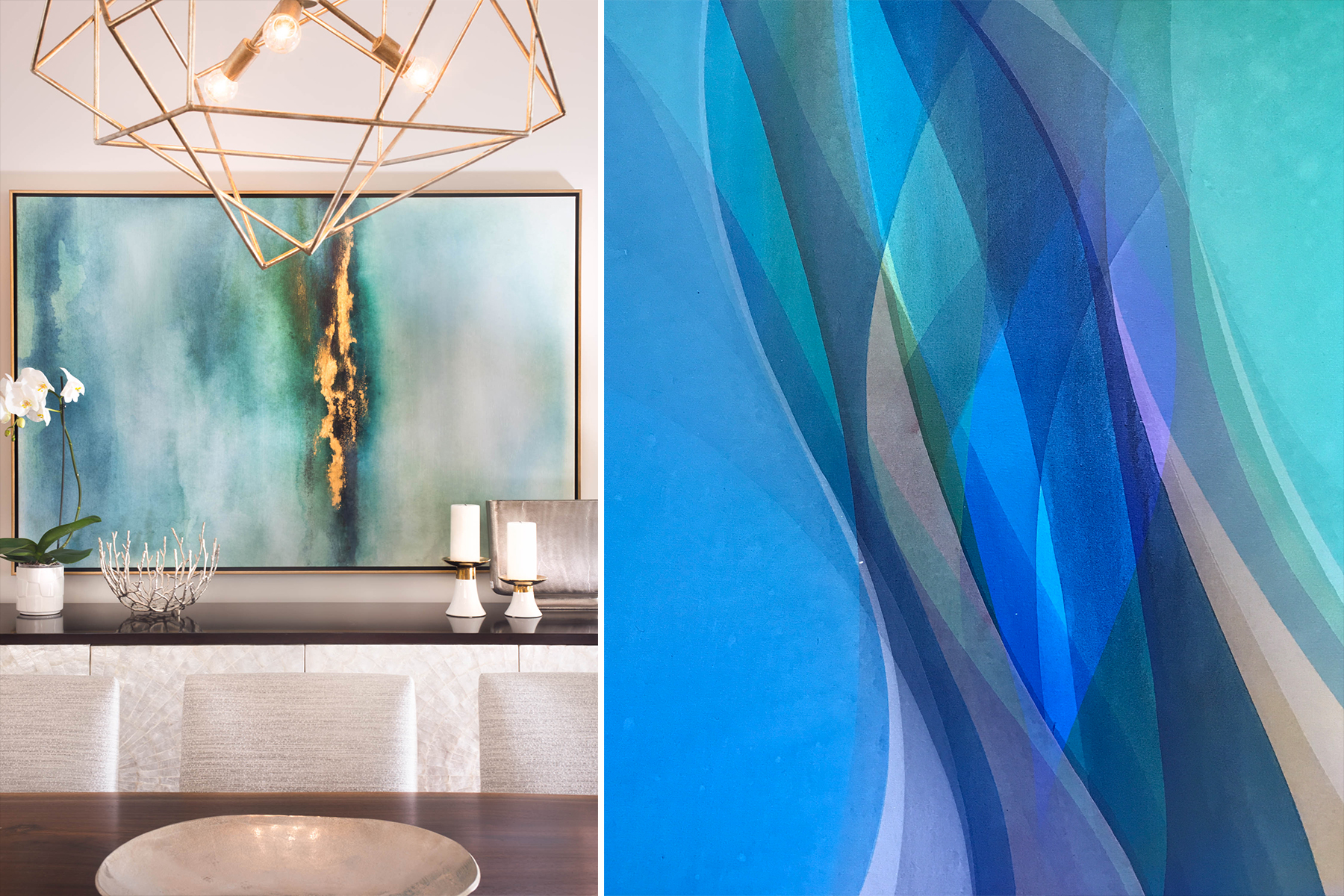 Left: Ali Budd Interiors, photographed by Stephani Buchman Right: Art by Paul Thomas, Mystical Infusion, acrylic on canvas